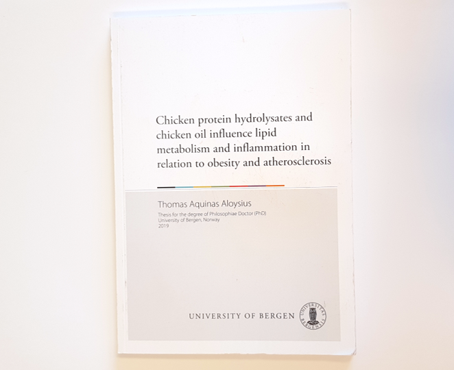 Thomas Aquinas Aloysius defended his PhD thesis 13 September 2019 for the PhD at the University of Bergen (UiB): Chicken protein hydrolysates and chicken oil influence lipid metabolism and inflammation in relation to obesity and atherosclerosis. The doctoral student is from Jaffna in Sri Lanka. He has a Master of Science degree in molecular biology from UiB.